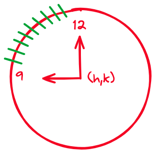 If we're aiming for points between the 9 and 12 on a clock, we're dealing with a π/2 radian arc. To evenly space 6 points across this quarter-circle, we slice the arc into 6 segments, each π/(2⋅6) radians apart. Starting from the 12 o'clock position, we increment our angle by π/(2⋅6) radians to find the next point, repeating this until we reach the 9 o'clock position.
