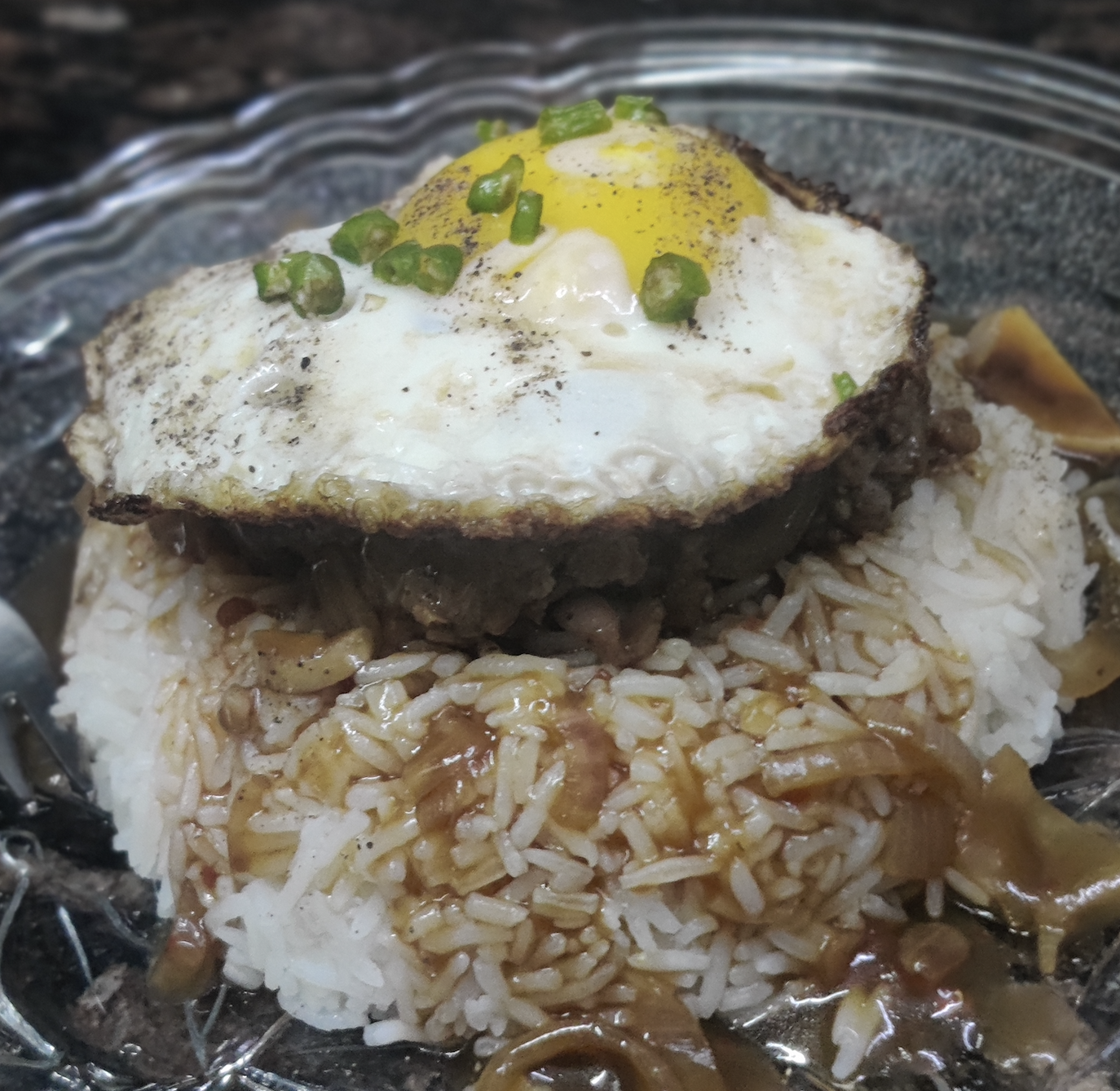 Loco Moco was a recommendation from Leland Takamine. This is my brother's favorite one which he wants me to cook again. Again in the absence of ground beef, we cooked this with goat meat. The taste of eating all three layers of rice, meat patty, and egg will take you to another place.
