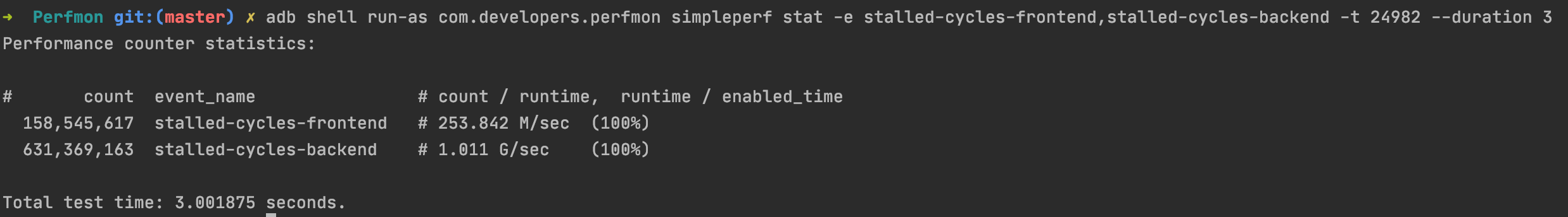 adb shell run-as com.developers.perfmon simpleperf stat -e stalled-cycles-frontend,stalled-cycles-backend -t 24982 --duration 3Here -t refers that profiling is done for thread and 22600 is the main thread id.
